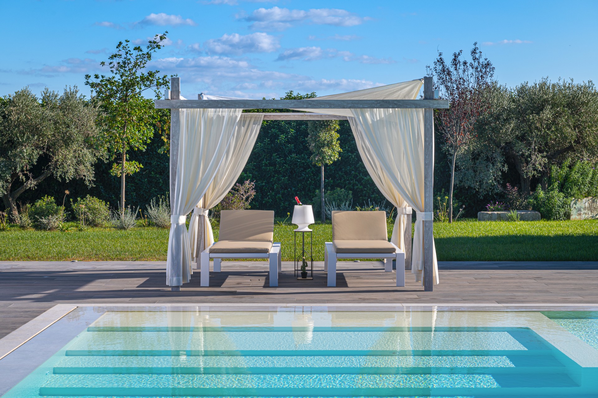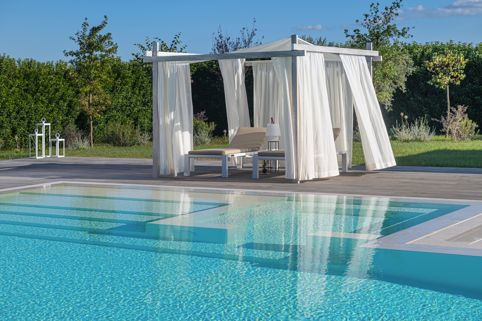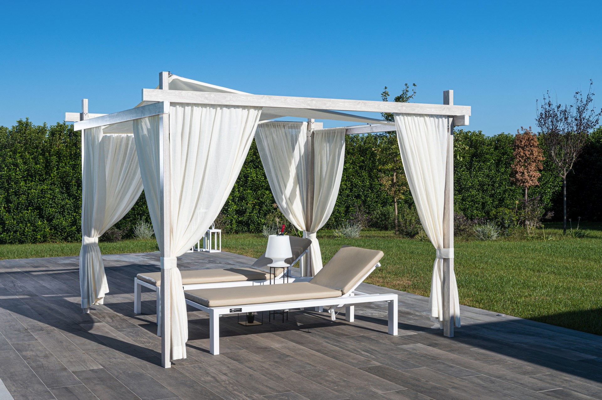 Un elemento unico di design in grado di arredare qualsiasi spazio. Questo gazebo è una rivisitazione delle robuste strutture in legno, ne riprende lo stile e ne aumenta le funzionalità grazie alla struttura interamente realizzata in profilati di alluminio e a quattro tende poste ai lati. Transforma ogni location in un luogo dove trascorrere momenti indimenticabili, offrendo un solido riparo.